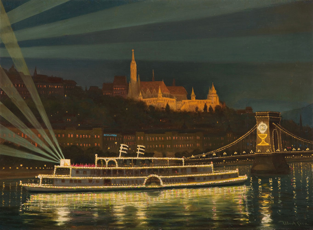 "Eucharisztikus flottatűntetés" Budapesten. Fent a SZENT ISTVÁN gőzös Ulrich Géza "Eucharisztikus Világkongresszus 1938-ban" c. festményén, lent a m. kir. Honvéd Folyamerők hadihajói és az esti fényjáték.