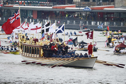 A "szabadidő-hajók" és a Nemzetközösségi tagállamok lobogóit hordozó tengerészkadétok elhaladnak az HMS BELFAST könnyűcirkáló (1939) előtt.Csaknem 700 hajó lepte el a Temzét Londonban, ehhez jött még a kb. 200 biztosító- és irányító feladatot ellátó bárka és motoros, vagyis mindösszesen mintegy 1 000 különféle vízi jármű. A különböző csoportokba osztott hajók minden szakasza élén egy "hírnök uszály" haladt. Ezek közül az első egy úszó harangláb volt, amelyen a Whitechapell Bell öntöde 8 új (külön erre az alkalomra készített) harangja kongott. Hangjukra a folyóparti templomok harangkórusa válaszolt. A 14 híd alatt áthaladó parádé - amelyben a királynő is részt vett - csaknem három óra hosszat tartott. A 85 éves uralkodónő és 91 éves férje, bár egy-egy kényelmes szék is a rendelkezésükre állt, egész idő alatt álltak a rendelkezésükre bocsátott hajó fedélzetén. A britek lelkesedése határtalan volt. A BBC News internetes adásán élőben volt követhető a több helyszínről jelentkező közvetítés. A műsorban megkérdezett egyik bámészkodó - egy fekete afrikai apuka és a kislánya - arra a kérdésre, hogy miért jöttek el, magától értetődő természetességgel válaszolták: "Mert ez a MI történelmünk része". Közben az egyik afganisztáni brit katonai támaszpontot kapcsolták, ahol a legénység szintén a jubileum megünneplésére készült: rezesbanda játszotta a "Rule Britannia"-t. A szomszédos Pakisztánban - a Nemzetközösség egyik tagállamában - a gyermekek Union Jack-et festettek az arcukra (akár egy futballmeccs szurkolói), s úgy köszöntötték a királynőt, a Monarchiát és Britanniát. A britek és a londoniak többsége velük értett egyet: a Hammersmithben "Ne ünnepeljük EZT!" feliratú transzparensekkel a monarchia intézménye ellen protestáló brit republikánusok maroknyi csoportja jórészt észrevétlen maradt. IV. Feltámad a tradíció? II. Erzsébet, Nagy-Britannia és Észak-Írország Egyesült Királysága, s a Nemzetközösségi Királyságok királynője uralkodói gyémánt jubileumának (60. évfordulójának) június 5-én tartott ünnepi rendezvényein Csák János, Magyarország londoni nagykövete képviselte a magyar kormányt. A Temzén rendezett hajós felvonuláson - bár a királynőnek erdélyi magyar gyökerei is vannak (ükanyja Rhédey Claudina grófnő) - magyar hajó nem vett részt. Pedig a bemutatott magyar katonai hagyományok alapján Magyarország akár hadihajós alakulatot is küldhetett volna. Hogyan lehetséges ez? Nos, épp' a hajós felvonulás választott módja - folyami jellege - a válasz erre. Hisz' 2012-ben épp' 145 esztendeje annak a forradalmi jelentőségű magyar hajóútnak, amely története során elsőként szelte át vízi úton az európai kontinenst, bizonyítva ezzel, hogy lehetséges állandó hajójárat kialakítása a Fekete-tenger és az Atlanti-óceán között! Az utazás tervezője és kivitelezője Széchenyi Ödön[6] gróf volt, aki HABLEÁNY nevű gőzhajóján kelt át a kontinensen 1867. április 6. - május 18. között. A felkészülést már 1861-ben elkezdte, amikor a Duna-gőzhajózási Társaság HILDEGARD nevű hajóján és a FRANZ JOSEPH gyorsgőzösön gyakorolt (háromszor járt a Pest-Galac útvonalon, hogy kapitányi, kormányosi, gépészi és vízrajzi gyakorlatot szerezzen). Gépészeti ismereteit Vész Ármin műegyetemi tanár, hajózási ismereteit pedig Kenessey Albert[7] hajóskapitány segített elmélyíteni.