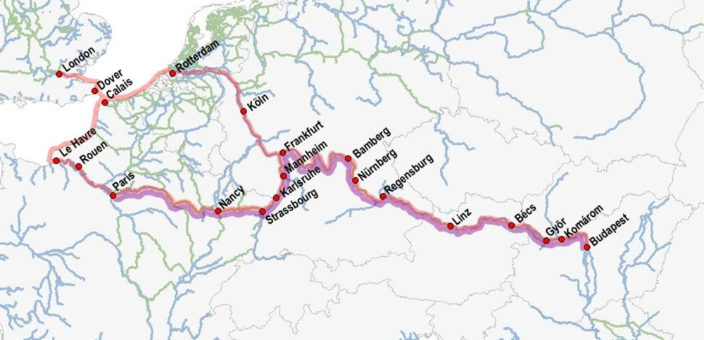 A Budapest-London-Párizs-Budapest vízi út (pirossal) és a HABLEÁNY útja (lilával).