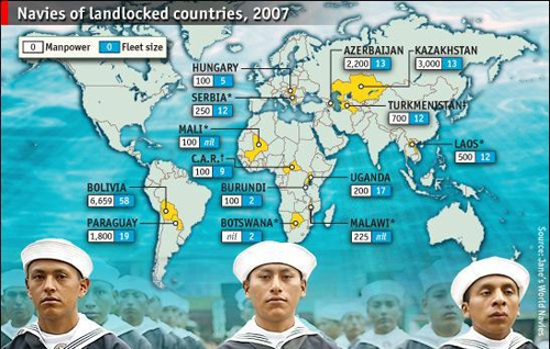 A tengertől elzárt országok flottái (2007). Az első és a második Bolívia és Paraguay, a harmadik Kazahsztán. A vizsgált flották a hadsereg, a rendőrség és a határőrség részét képezik.Egy ilyen utazás Európa első hajóval történő átszelése után azt is biztosítaná Hazánk számára, hogy az első hadihajója is magyar lehetne, amely átszeli a kontinenst (s útja egyben az Európát átszelő legelső hajó 145 éve véghezvitt első utazásának történelmi megismétlése lehet). A megvalósíthatóságot persze több kérdés befolyásolja. Néhány a legfontosabbak közül: a) Technikai kérdések: