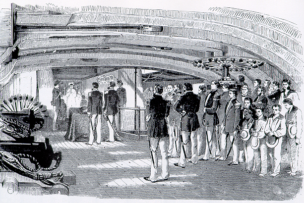 Von Marochini atya által celebrált "Te Deum" mise a Novara fedélzetén 1857-ben. Joseph Selleny eredeti rajza után készült metszet.Klikkeljen a képre!