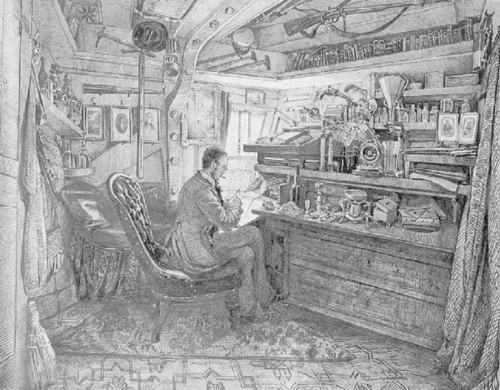 Egy tudós kabinja a Novarán, 1857-ben. Joseph Selleny eredeti ceruzavázlata nyomán. A rajzon az íróasztalánál dolgozó Ferdinand Hochstetter geológus látható.