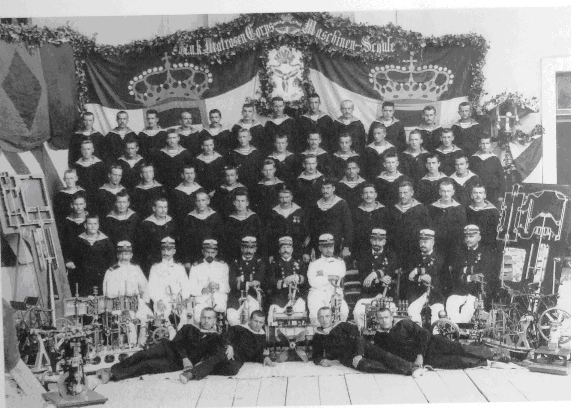 Végzős évfolyam a "Mechanikan Schule"-ban. A 17 kiképzőszázad munkáját nehéz részleteiben bemutatni, de az iskolák tanárszemélyiségei fölött nem szabad elsiklani. Olyan kiváló szakemberek tanítottak akár a gépészeti iskolában, akár más oktatási részlegnél, akik a korszak legmagasabb szintű technikai felkészültségével rendelkeztek, sokszor a szárazföldi életben is komoly elismerést vívva ki maguknak. Nincs külön sorozási körlete a haditengerészetnek. Az egész birodalom területéről soroznak. Sokan önként jelentkeznek részben a kalandvágy, perspektíva miatt. 4év a rendes szolgálati idő, utána a tengerész tartalékosként lesz nyilvántartott az illetőségi helyén. A tengerésztisztek (14-15 éves kortól) a Fiumei Tengerészeti Akadémián tanultak (4 év), egy évig hajón szereztek tapasztalatokat, majd Pólában (+1év) tették le a vizsgáját. Ezután még a gyakorlatszerzés és a szakképzések sora várta a jelöltet. Ezután még a gyakorlatszerzés, és a szakképzések sora várta. Az alapkiképzés után speciális alakulatokhoz válogatják az embereket. 17 féle különleges kiképzőszázad gondoskodott a kiképzésről. Ehhez tartozott 17 oktató és vezérlő parancsnokság. A századok szárazföldi épületekben és iskolahajókon voltak elhelyezve. A képzési idő 3 - 6 hónap, majd elkerülnek a hajókra.[26] A kiképzőhajókon, illetve a hadihajókon egymást érve zajlódtak a gyakorlatok.[27] Mindenkinek, a tiszteknek is kellett mindenhez érteni. A szaktárgyak között szerepelt a hajóépítéstan, géptan, gépkezelés, "nautika", tengerészeti ismeretek, gyakorlati hajózás, gép és vitorla manőver, tüzérségi (ballisztika, és gyakorlat), tengerész hadtörténelem, taktika, rádió és "elektro" - ismeretek, nemzetközi tengerjog, büntetőtörvénykönyv ismeret, gyalogsági gyakorlat, egészségtan.[28] Ezen felül kellett tánc-zene és illemtan, angol, német, francia, olasz, horvát illetve a birodalom nyelveiből egy, azok irodalmi műveltségével egyetemben, történelem, fizika, kémia, biológia stb.. Ebből kitűnik, milyen fontos volt az általános műveletség is. Ennek felértékelődik a jelentősége, ha a tengerésztisztekre, mint diplomáciai küldöttekre, és érdekérvényesítőkre is gondolunk. A tengerészek a szárazföldi katonai akciókba is bevonhatóak voltak, önálló, a hajón szolgálók közül szervezett tengerészkülönítményként, vagy szövetséges, esetleg helyi/nemzetközi szárazföldi katonai erő kiegészítése érdekében. Ilyenkor annak alárendelve és azzal együttműködve, de saját parancsnok irányítása alatt álltak és harcértéküknek, felkészültségüknek meg kellett egyezni a szárazföldi csapatokéval. Ezt szem előtt tartva speciális felszerelésben és kiegészítőkkel (15kg-os csákány, lapát, tábori ágyú stb.) ágyú, gyalogsági fedezék építését, futóárokásást, főzőfülkék vájását, hídépítést, robbantás technikát, vasútépítés stb. is tanultak.[29] Erre a tudásra többször szüksége volt a tengerészkülönítménynek a világ több pontján.