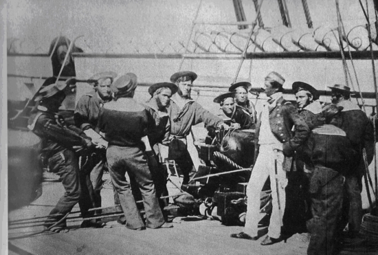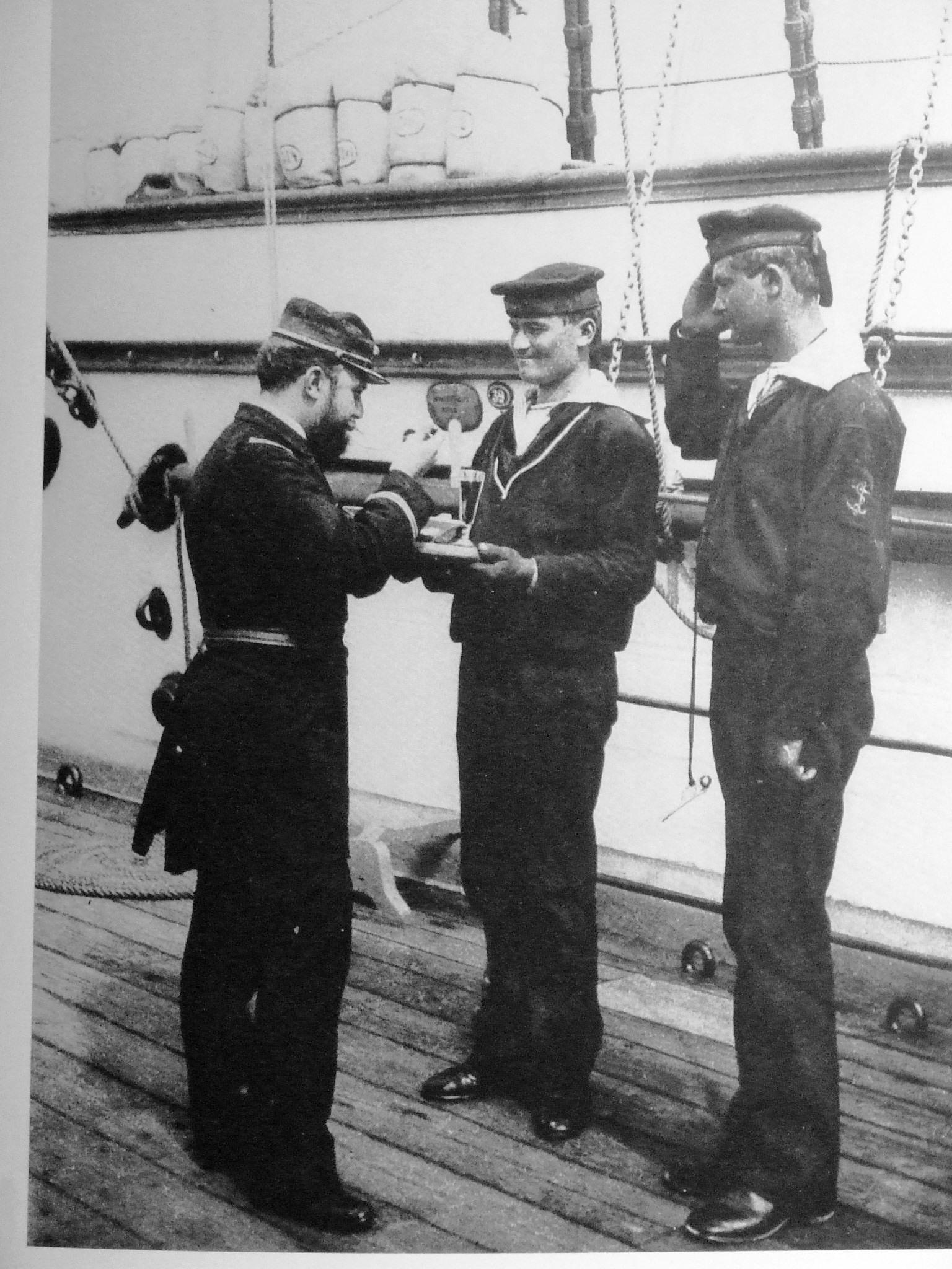 A képen az étel "előkóstolása" látható. Ez a szokás nem csak a vitorlás hajókon, hanem mind a három periódusban kötelezően megvolt. A mellvéden a Hängemattok láthatóak fölrakva a csarnakkötelek előtt.